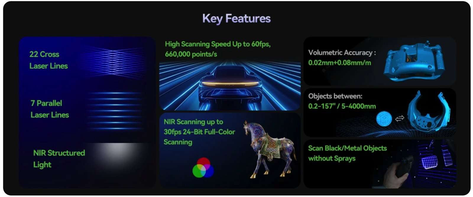 - Wysoka dokładność i szybkość: Dzięki zastosowaniu 22 krzyżujących się linii laserowych i 7 równoległych linii laserowych, Raptor Pro osiąga dokładność do 0,02 mm oraz prędkość skanowania do 60 klatek na sekundę, co przekłada się na 660 000 punktów na sekundę.