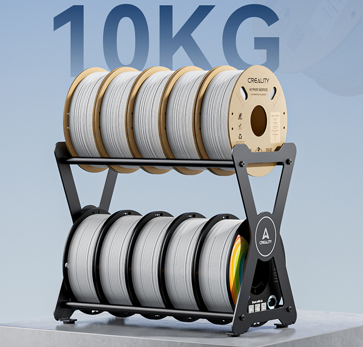 Dwupoziomowy stojak, który może pomieścić 10 rolek filamentów po 1 kg. Odpowiedni do przechowywania żywicy wrażliwej na promieniowanie UV.