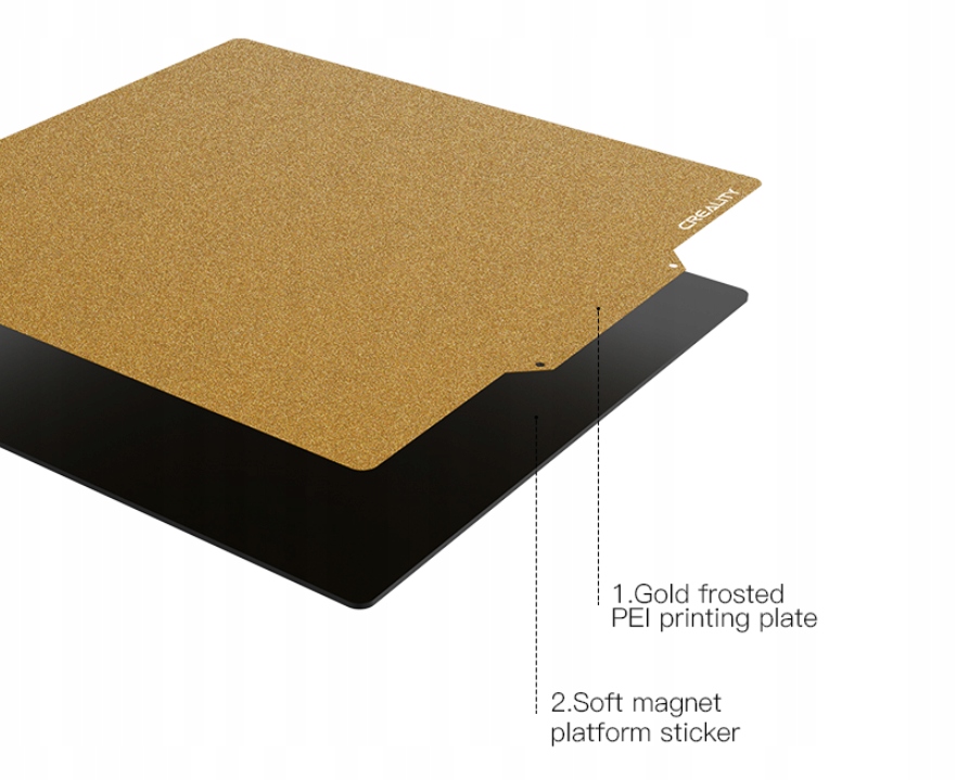 Podkładka Creality PEI składa się z dwóch części. Magnetycznej i adhezyjnej części PEI. Część adhezyjna jest elastyczna, dzięki czemu po skończeniu wydruku będziemy mogli nasz wydruk łatwo odkleić od podkładki.