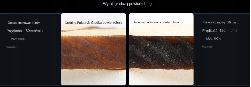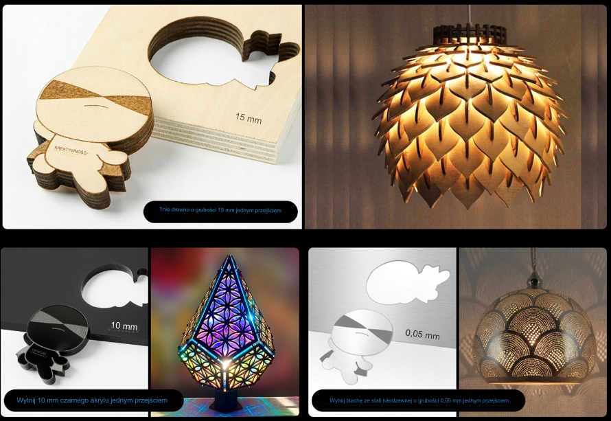 - Może ciąć 20mm drewno przy jednym przejściu, 30mm czarny akryl przy jednym przejściu i 0,15mm blachę ze stali nierdzewnej przy jednym przejściu.